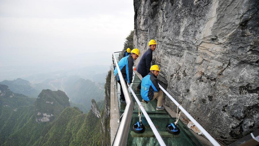 蘭迪機器(洛陽蘭迪玻璃機器股份有限公司簡稱蘭迪機器,是一家專業從事玻璃鋼化爐研發、銷售的高新技術企業。)近日了解到,張家界天門山景區棧道近期已開始更換棧道景觀玻璃,目前西線棧道玻璃更換完工,預計五一小長假對外開放。天門山西線玻璃棧道于2011年10月1日正式開放,驚險刺激的視覺感受吸引了海內外游客前來觀光體驗。截至2015年3月,該棧道已接待中外游客430余萬人。下圖為施工人員在進行棧道玻璃的更換。