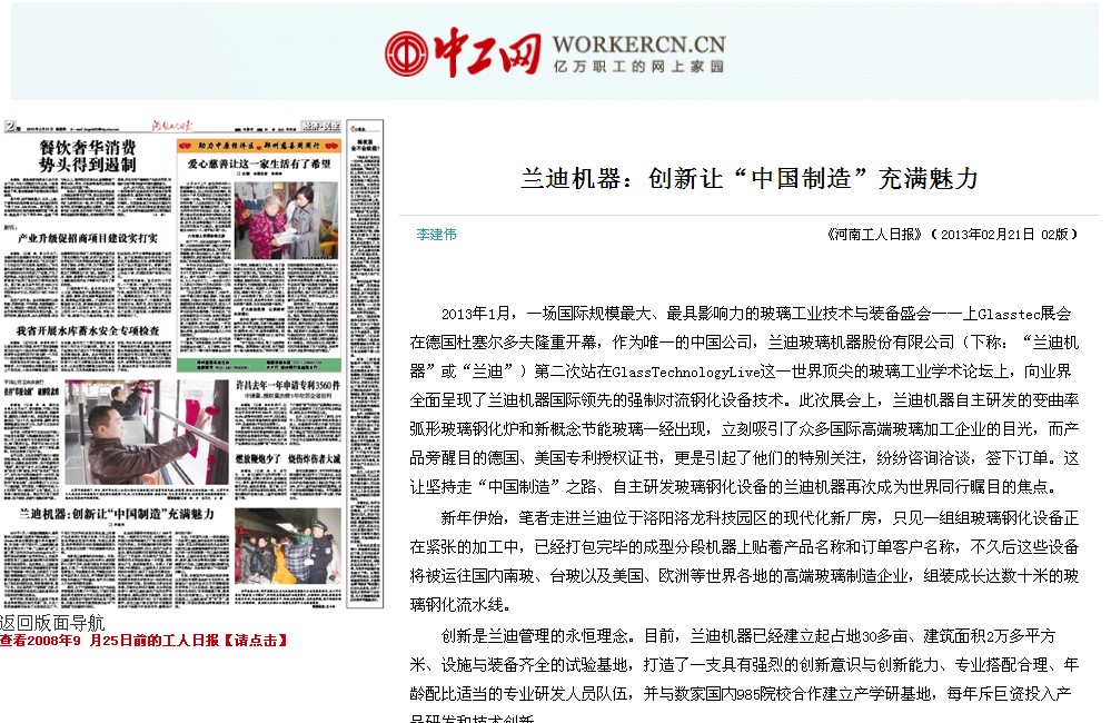 2013年1月,一場國際規模最大、最具影響力的玻璃工業技術與裝備盛會——上Glasstec展會在德國杜塞爾多夫隆重開幕,作為唯一的中國公司,蘭迪玻璃機器股份有限公司(下稱:“蘭迪機器”或“蘭迪”)第二次站在GlassTechnologyLive這一世界頂尖的玻璃工業學術論壇上,向業界全面呈現了蘭迪機器國際領先的強制對流鋼化設備技術。此次展會上,蘭迪機器自主研發的變曲率弧形玻璃鋼化爐和新概念節能玻璃一經出現,立刻吸引了眾多國際高端玻璃加工企業的目光,而產品旁醒目的德國、美國專利授權證書,更是引起了他們的特別關注,紛紛咨詢洽談,簽下訂單。這讓堅持走“中國制造”之路、自主研發玻璃鋼化設備的蘭迪機器再次成為世界同行矚目的焦點。 新年伊始,筆者走進蘭迪位于洛陽洛龍科技園區的現代化新廠房,只見一組組玻璃鋼化設備正在緊張的加工中,已經打包完畢的成型分段機器上貼著產品名稱和訂單客戶名稱,不久后這些設備將被運往國內南玻、臺玻以及美國、歐洲等世界各地的高端玻璃制造企業,組裝成長達數十米的玻璃鋼化流水線。 創新是蘭迪管理的永恒理念。目前,蘭迪機器已經建立起占地30多畝、建筑面積2萬多平方米、設施與裝備齊全的試驗基地,打造了一支具有強烈的創新意識與創新能力、專業搭配合理、年齡配比適當的專業研發人員隊伍,并與數家國內985院校合作建立產學研基地,每年斥巨資投入產品研發和技術創新。 然而,由于中國玻璃設備生產企業起步較歐美大約晚了半個世紀,中國自主制造的具有高技術水平的大型設備要進入歐美,甚至是在中國的外資企業也十分困難,其最大競爭對手就是歐美企業對“中國制造”的懷疑和不信任。